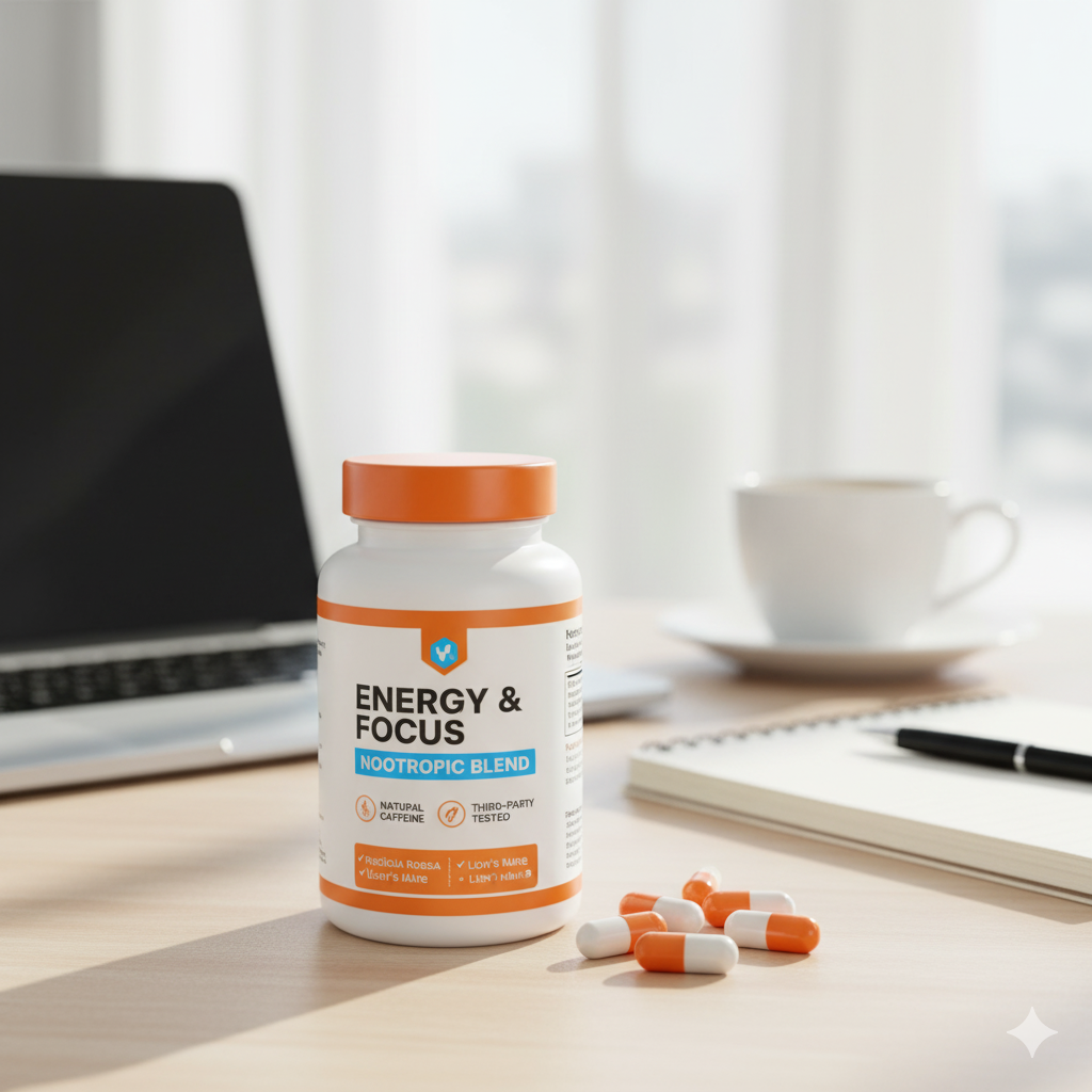 Elevate your mental clarity and vitality with Energy & Focus. Our nootropic blend combines adaptogens with B-Vitamins and natural caffeine for a sustained, crash-free energy lift. It may help to enhance cognitive function, reduce mental fatigue, and improve concentration.